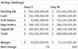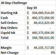 Not too much to say today. I am going to be gone over the weekend (Days 10 and 11), and I have been trading in Jita so far. My plan, given the whole "Jita Burns" event on the 24th, is to let my orders wind down while I am gone and move shop when I get back. I suspect business will not be good once the camp hits, and I plan to be out of the way. In order to stay true to my plan, I am going to move only myself when I go. Since I will be missing this weekend, it seems fair to move when my orders have essentially stopped, and just transfer my pool of isk.